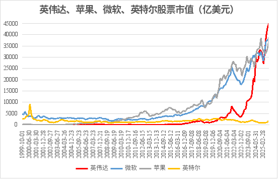 英特尔1971年上市,英伟达1999年上市,1999年底英伟达市值14亿美元,英特尔2744亿美元,英特尔是英伟达的190倍。2020年英伟达市值超越英特尔是个转折点,此后英伟达市值虽然也经历两次大跌,总体上是迅猛增长。2025年10月24日,英伟达市值45261亿美元,英特尔1824亿美元,英伟达是英特尔的25倍。2025年10月24日市值和1999年底比,英伟达增长了3138倍,英特尔下降了34%。决定这巨大差异的,就是英伟达对CUDA投入的决心,和英特尔对Larrabee项目的半途而废。